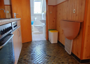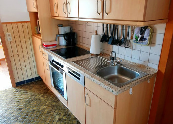 - Mit Ceran-Kochfeld, Backofen, Mikrowelle, Geschirrspüler, Wasserkocher, Kaffeemaschine, Kühlschrank mit Gefrierfach