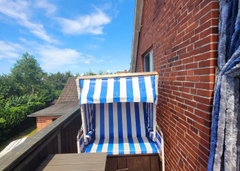 - Möblierter Balkon (u.a. Strandkorb) mit Sonnenschirm